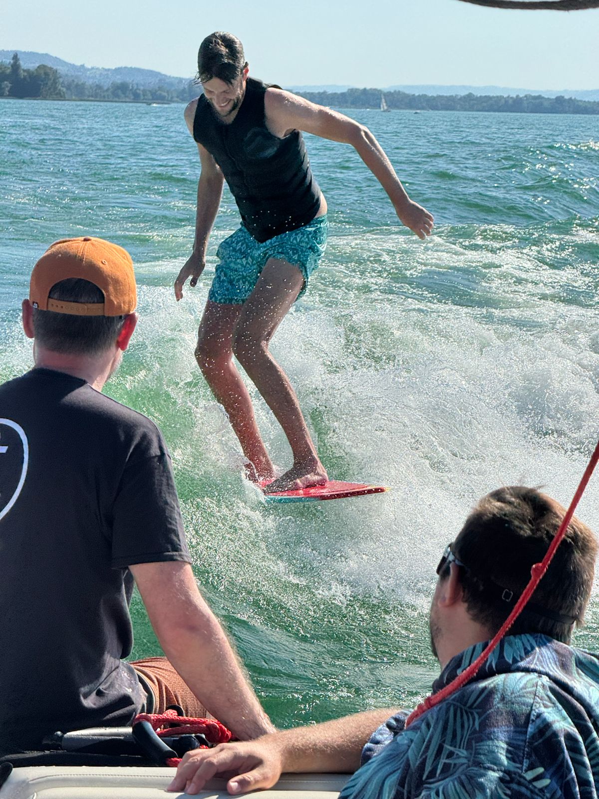 Ein Tag raus aus dem Alltag, rein ins Vergnügen: Unser Team hat sich aufs Wasser gewagt – und wurde belohnt. Beim Wakesurfen hatten alle ihre Erfolgsmomente. Die Neulinge hielten sich erstaunlich lange ohne Seil in der Welle, während die Pros wilde Kurven zogen – mal klassisch, mal mit Foil. Erfolgsgefühle pur, begleitet von jeder Menge Lachen.